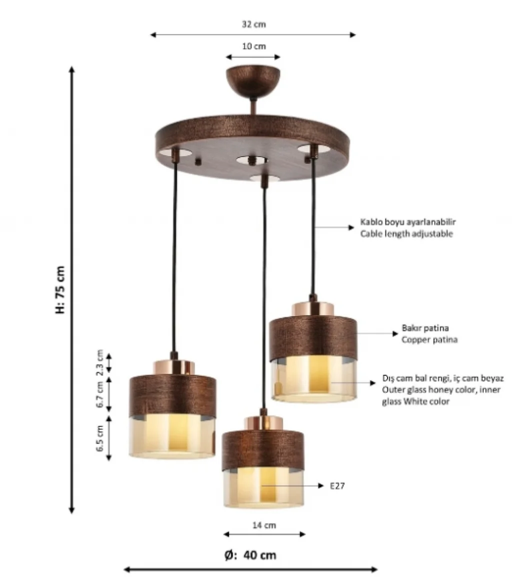 Aconn Üçlü Bakır Renk Kaplamalı Sarkıt Avize