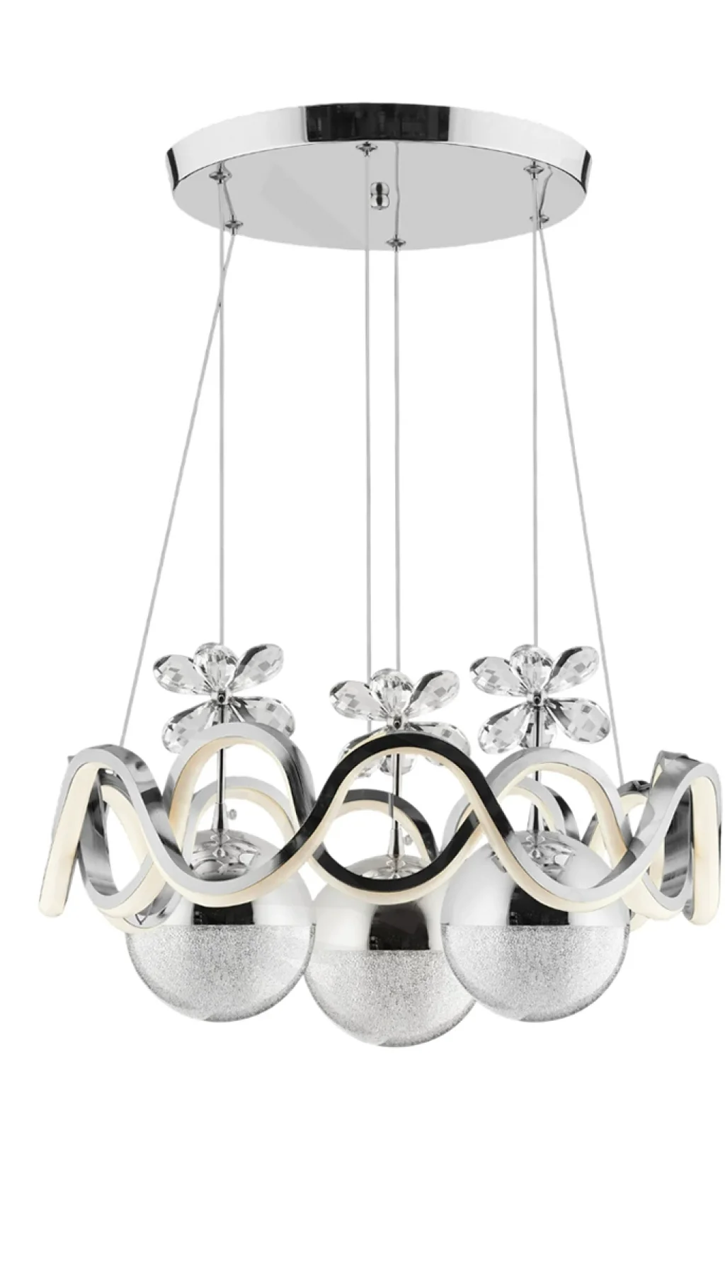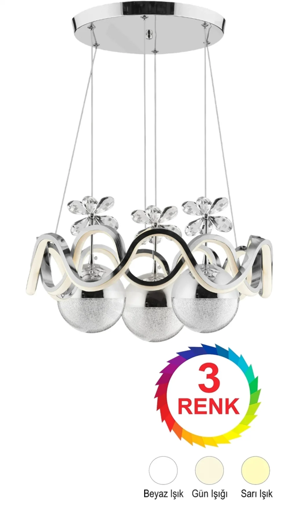 - Modern tasarımıyla salon ve oturma odanızın atmosferini zenginleştiren Orkide Krom Renkli 3'lü Toplu 3 Renk Kumandalı Ledli Avize, şıklığı ve fonksiyonelliği bir arada sunar.