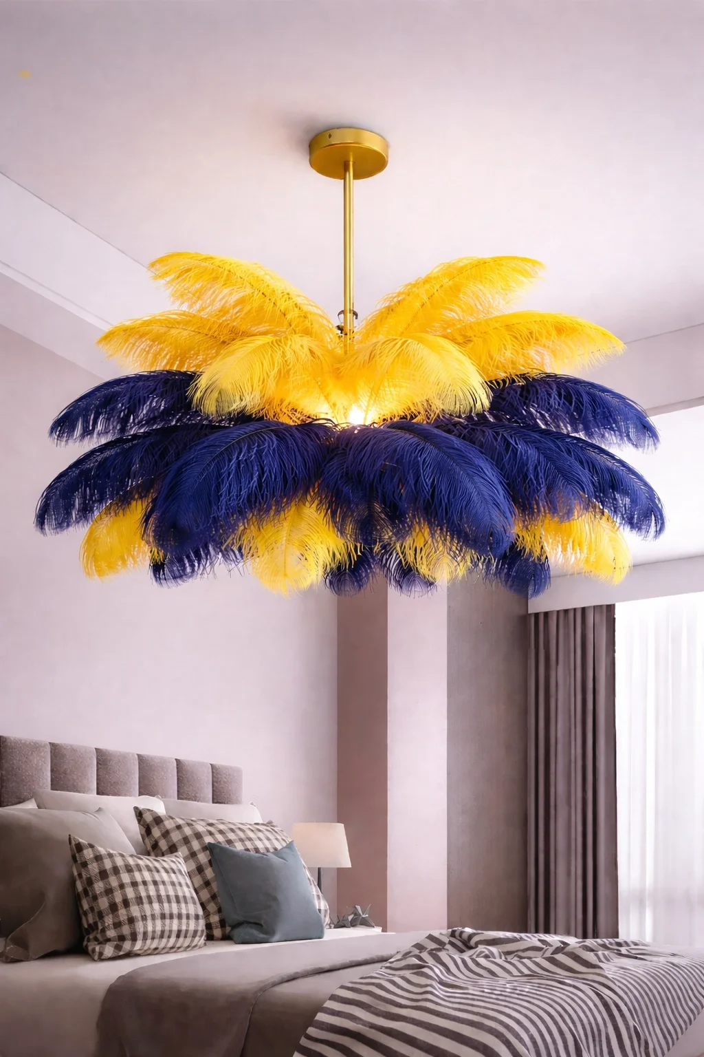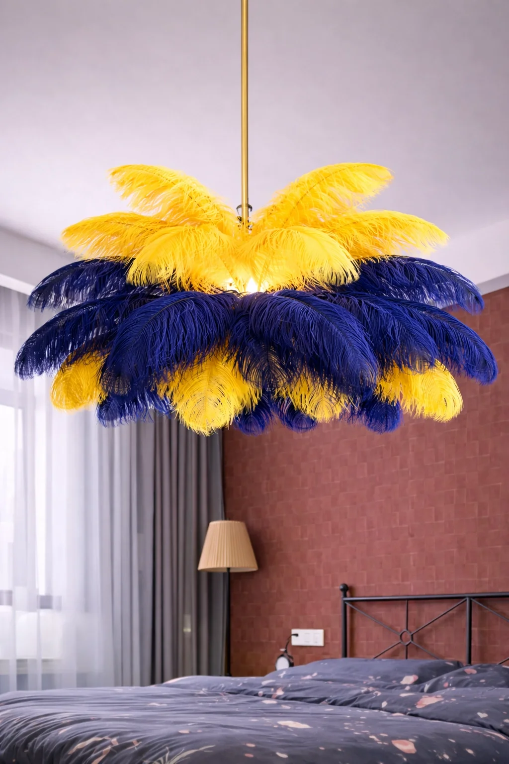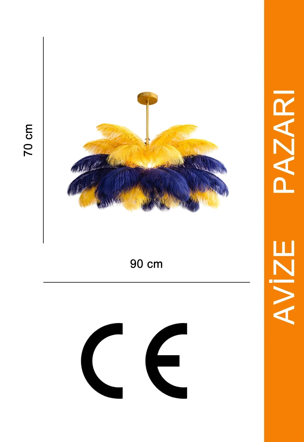 Sarı Lacivert Deve Kuşu Tüyü Sarkıt Avize